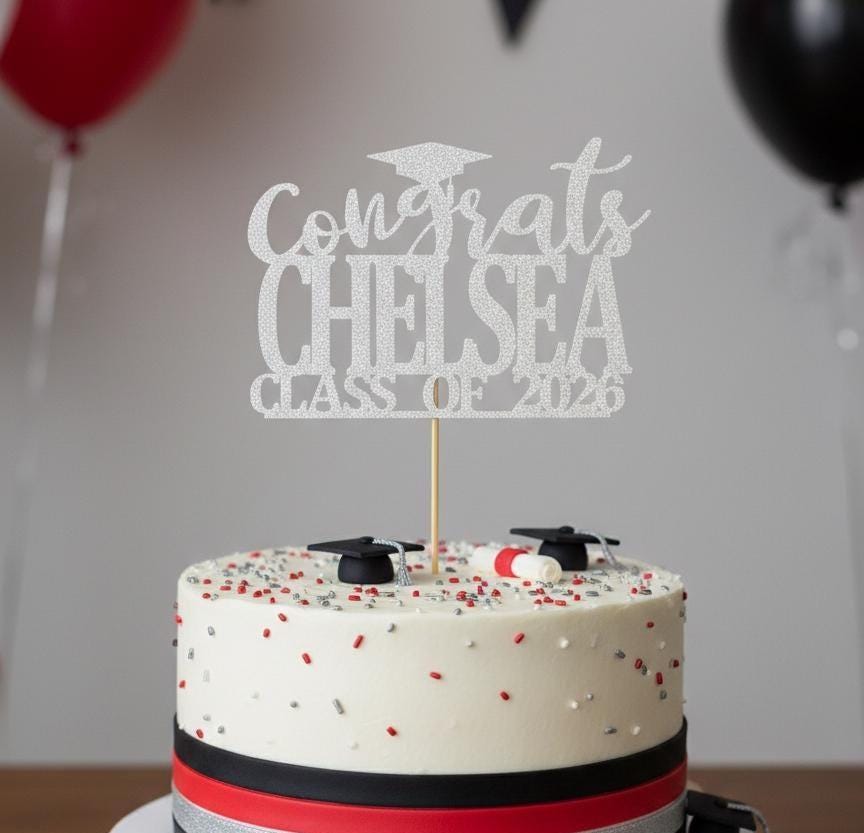 Make your graduation celebration feel truly special with a personalized glitter topper that turns any cake into the star of the party.