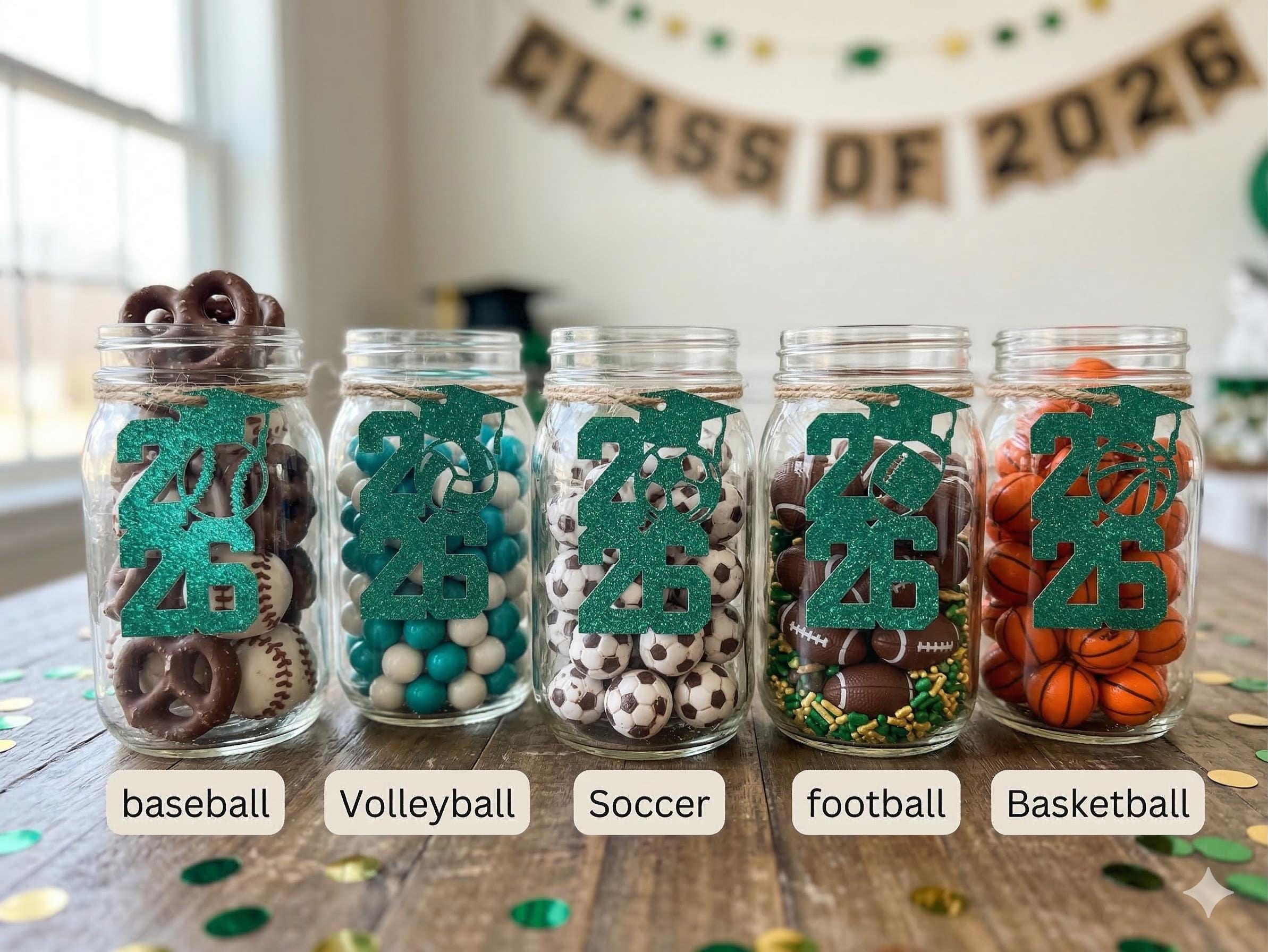 Celebrate your student athlete with these vibrant, custom Class of 2026 graduation tags! Perfect for adding a personalized touch to mason jars, floral centerpieces, or party favors. Each tag features the graduation year paired with a sport of your choice and a classic grad cap.