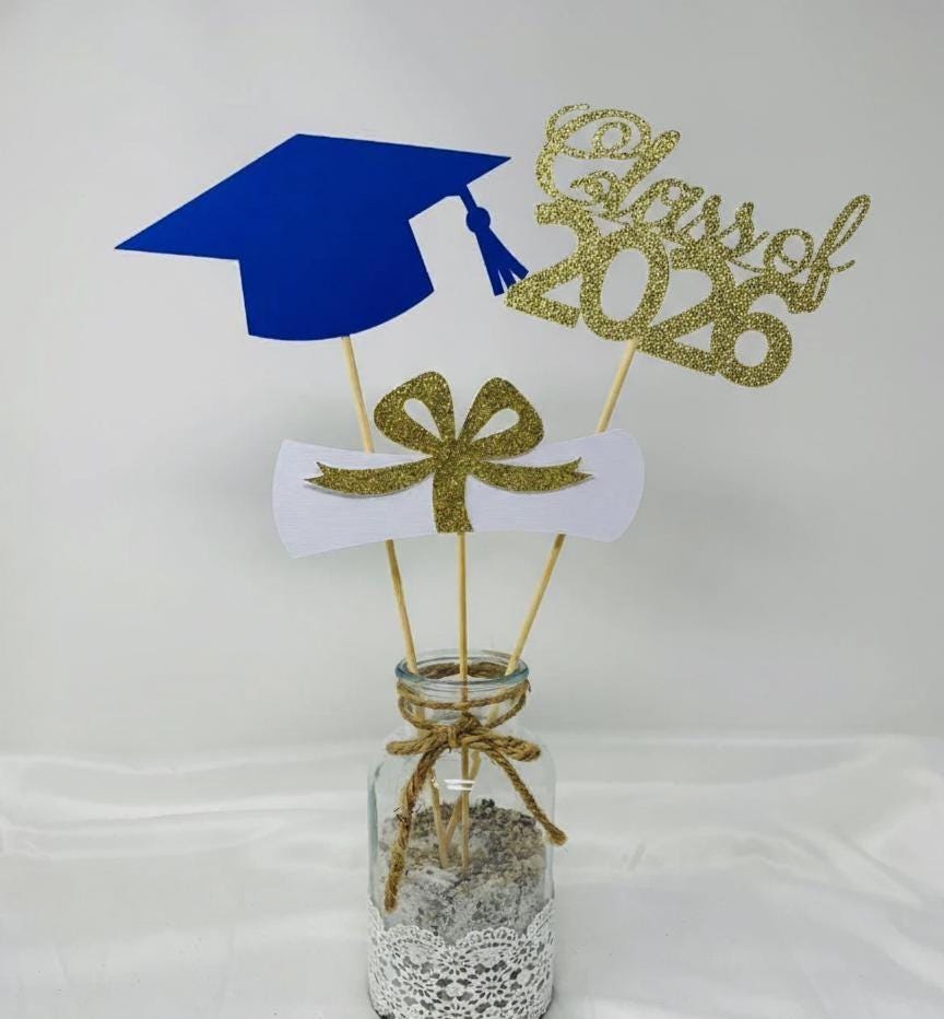 Celebrate your graduate's big milestone with this elegant, handmade centerpiece set! Perfect for floral arrangements, mason jars, or photo booth props, these glittery toppers add the perfect "pop" to any Class of 2026 celebration.