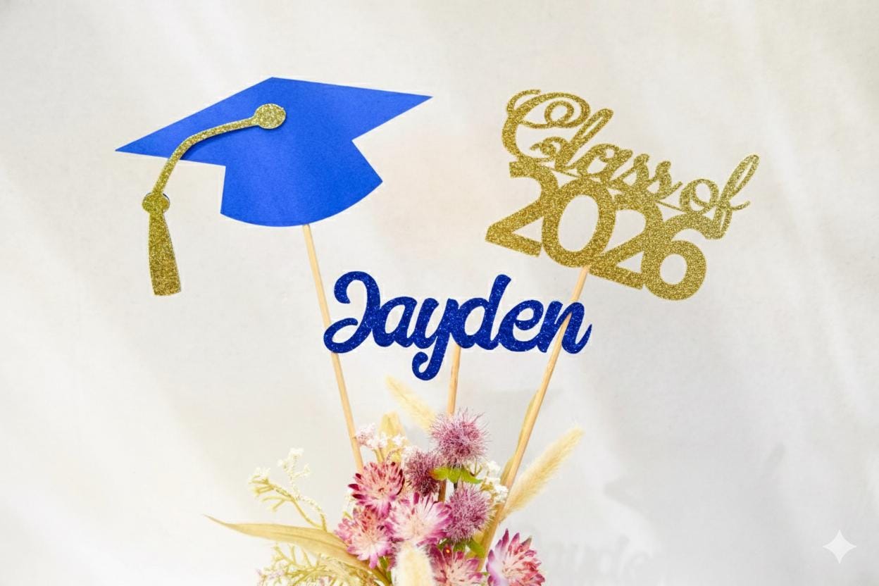 One grad cap with tassel, One Class of 2026 and One personalized name stick.