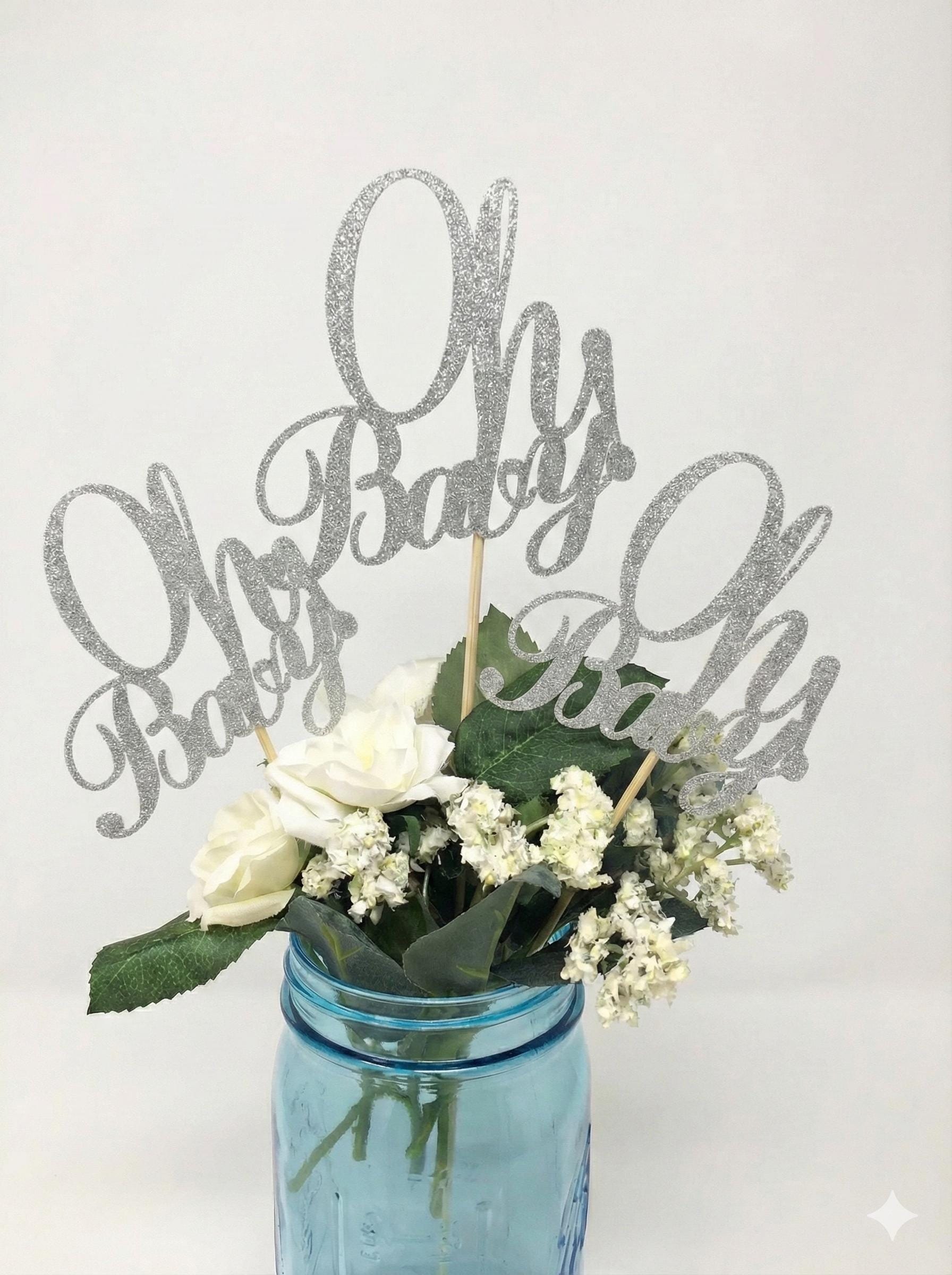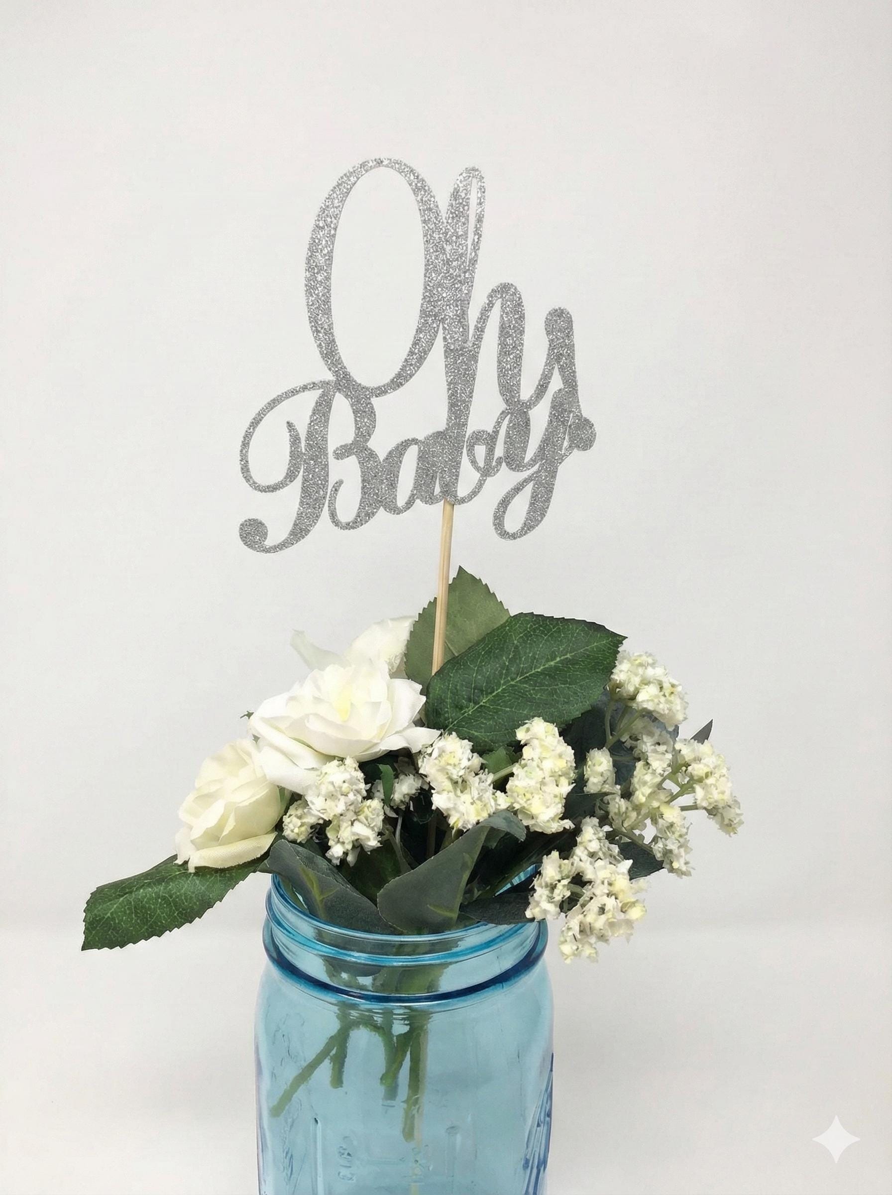 These beautiful baby boy decorations with the phrase "Oh Baby!”in a cursive font measure approximately 4" W x 4.5" H