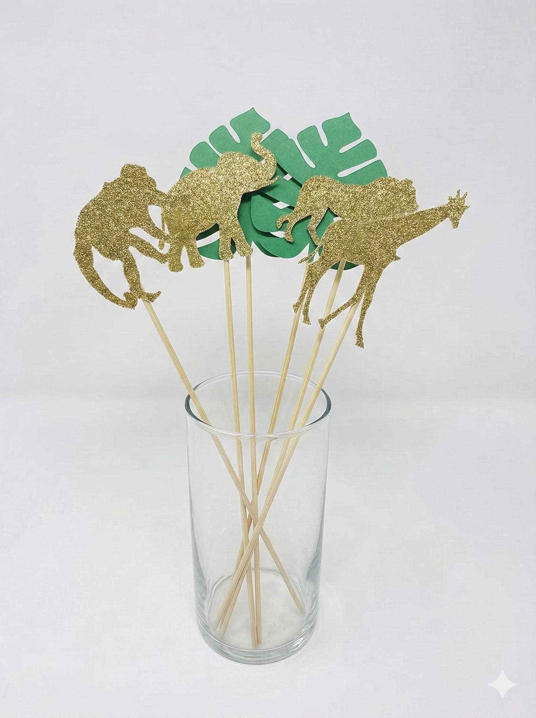 Designed specifically for Jungle-themed baby showers, Wild One birthdays, or Tropical nurseries, these handcrafted animal picks add the perfect touch of "wild" elegance to your cake or table arrangements.