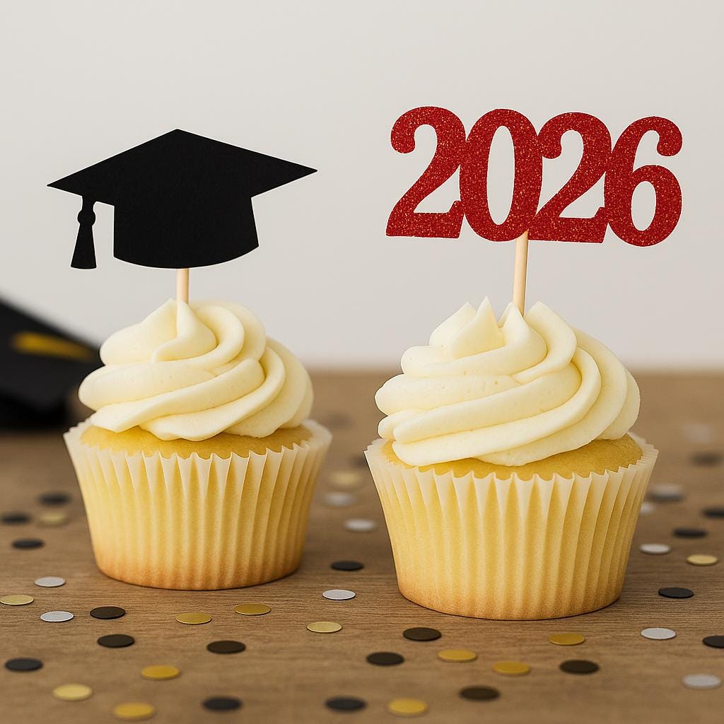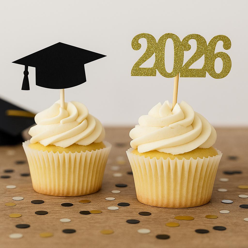 - set of 12 cupcake toppers (6 caps and 6 Years)